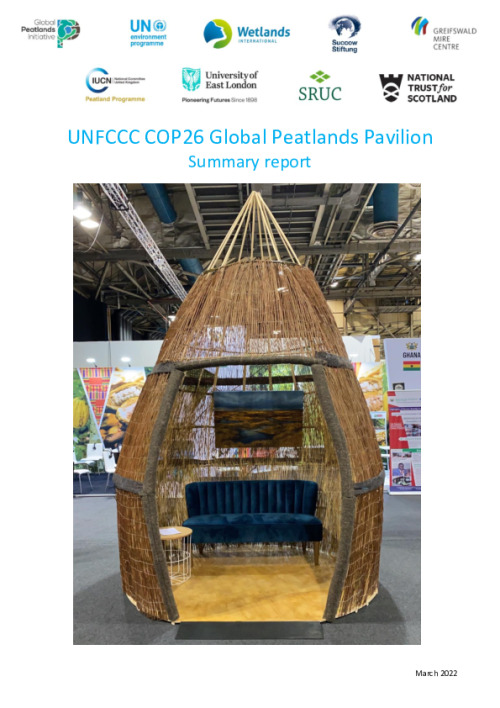 The Global Peatlands Pavilion took place from 1 to 12 November 2021 in Glasgow in the Blue Zone at the 26th Conference of the Parties to the UN Framework Convention on Climate Change. The Pavilion itself consisted of a physical space including a water droplet structure built out of reeds gathered from peatlands, and a 3D virtual pavilion with three “floors” of multi-media content, including over 200 exhibits. The programme brought together over 250 speakers from around the world from all sectors and disciplines. There were 45 sessions held over the 12 thematic days, covering topics such as peatlands in Nationally Determined Contributions, mobilising finance, adaptation and resilience, and peatland science and policy. Funded by a range of sponsors including governments, NGOs and businesses, the pavilion was the largest-ever gathering of its kind, with over 2700 people from more than 100 countries registering to the online platform and many more attending in person. It led to a number of impacts including the signing of a Memorandum of Understanding between Scotland and Chile to support the conservation, restoration and sustainable management of their peatlands. The pavilion launched the baseline map that will be used in the upcoming Global Peatlands Assessment; re-enforced commitments to include peatlands in NDCs in the Nile Basin; enabled dialogue on the development of a new European Peatlands Initiative; and hosted the launch of landmark reports by UNEP on the Economics of Conservation, Restoration and Sustainable Management of Peatlands, by Ramsar on Peatland Restoration Practice, and by IUCN UK Peatland Programme on peat-free horticulture – Demonstrating Success.