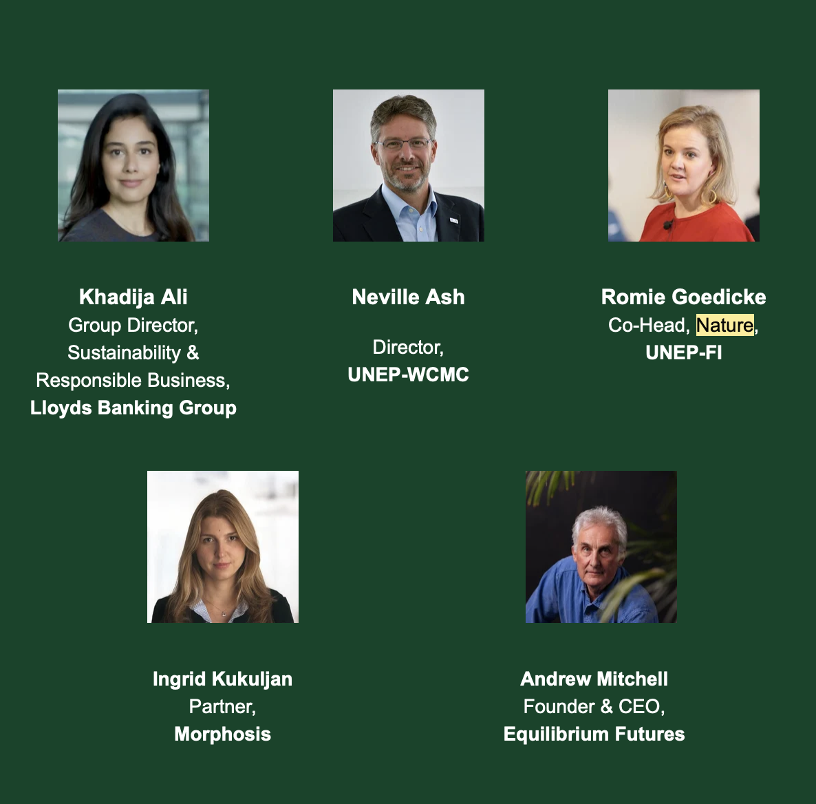 The Dialogues will feature speakers and organizations from across the business and nature landscape. Structured around interactive workshops and discussions, attendees will have opportunities to share collective knowledge and experience on: