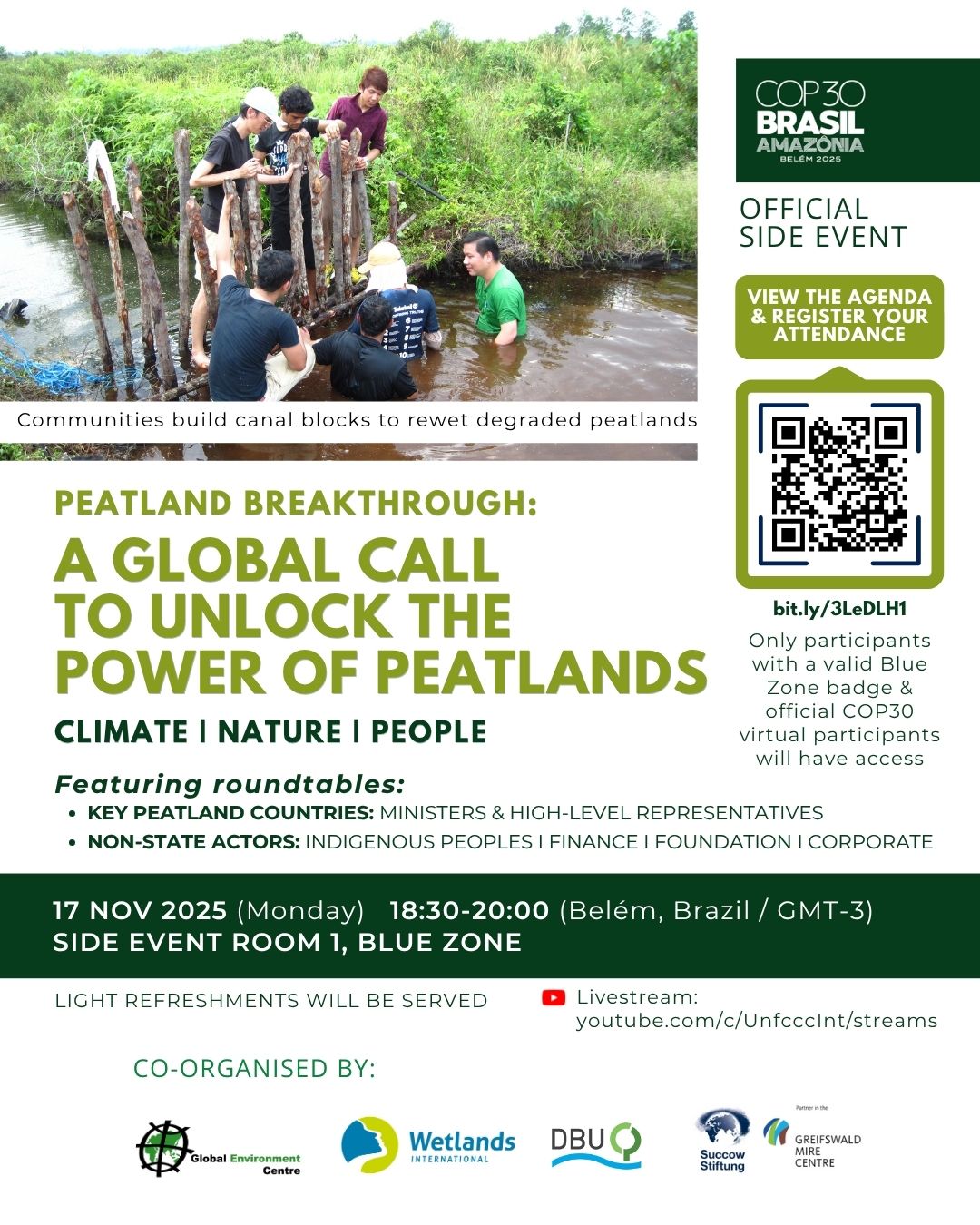 The session will highlight the growing coalition of Champion Countries and partners, showcasing how collective leadership and multi-sector partnerships can mobilize knowledge, policy, and finance for transformative peatland action. The discussion will build momentum and shared ownership of the Peatland Breakthrough, reaffirming peatlands as critical ecosystems for climate mitigation and adaptation, biodiversity, water security, and resilient livelihoods.